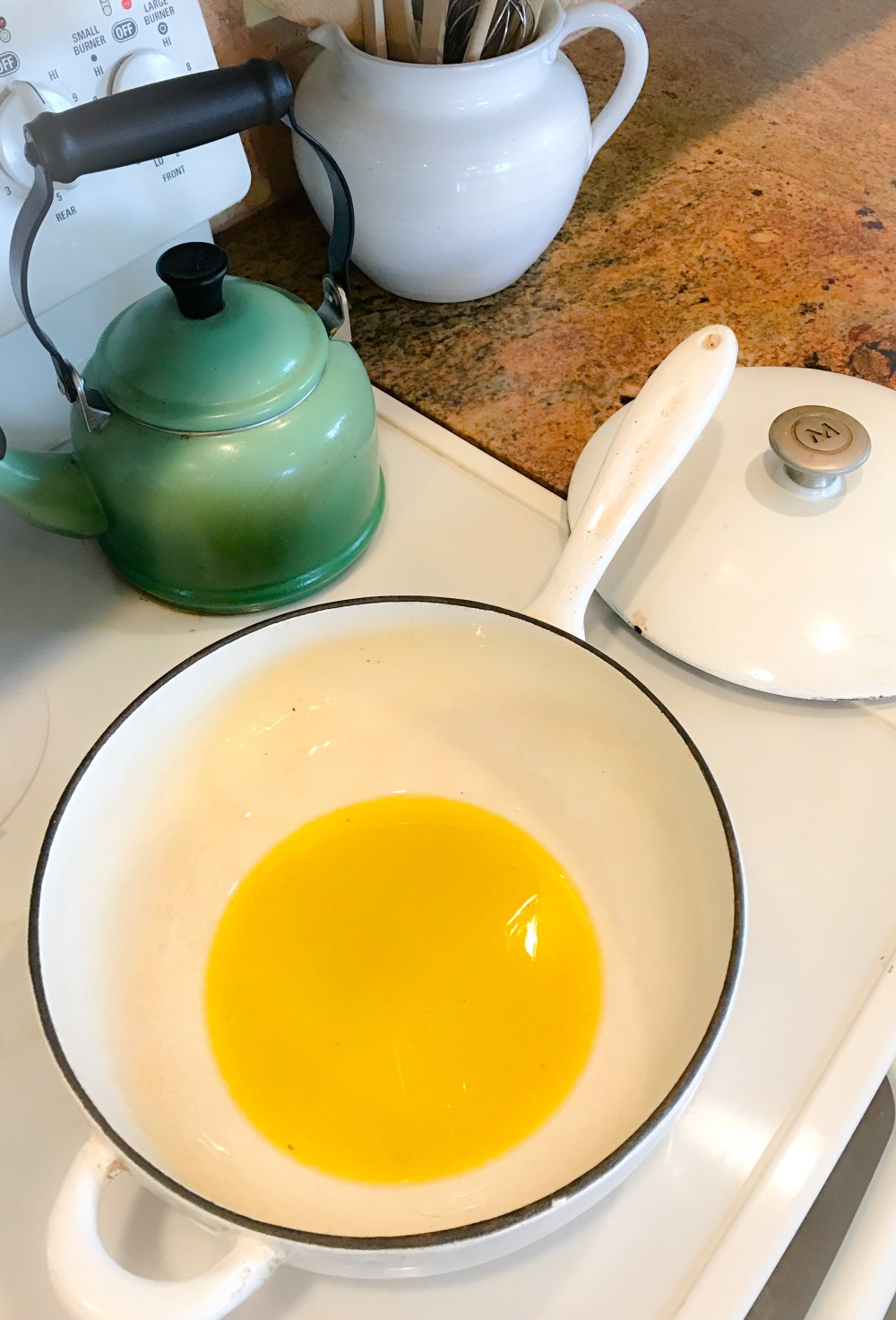 I use a laminated, cast iron Dutch oven. Place on burner on medium-high and add olive oil.