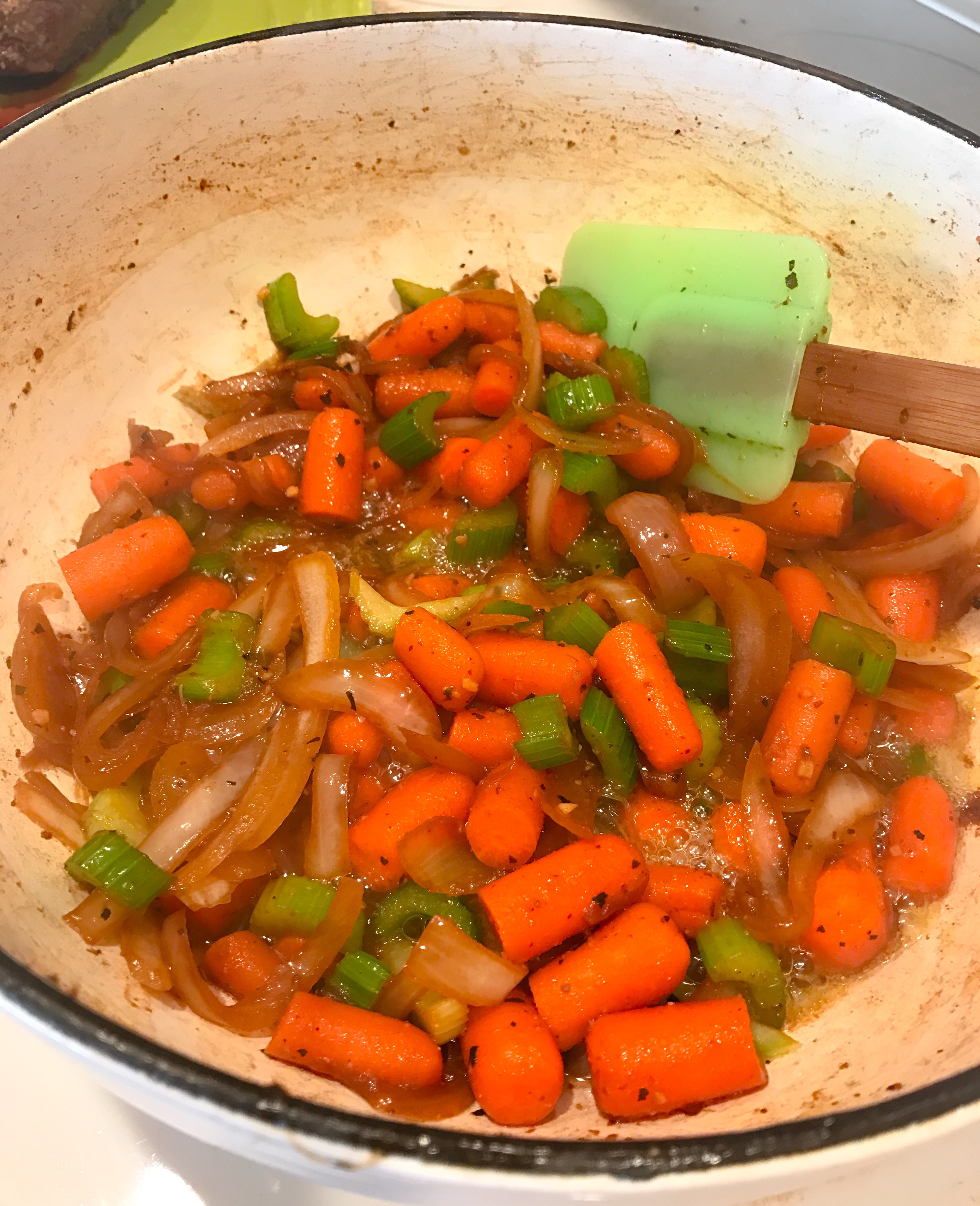 Set the meat aside to rest, once seared. In the same hot Dutch oven, reduce heat to medium, and add your onion. I like to add the onion alone initially, and push it around with a spatula as it softens to gather the crunchy meat leftovers from the bottom. FLAVOR YOU GUYS. If you don’t have a high-heat spatula, I’d recommend picking one up. Once onion is soft and starting to brown, toss in your carrots, chopped celery, and garlic. Cook all the veggies together until soft, about 5-7 minutes.