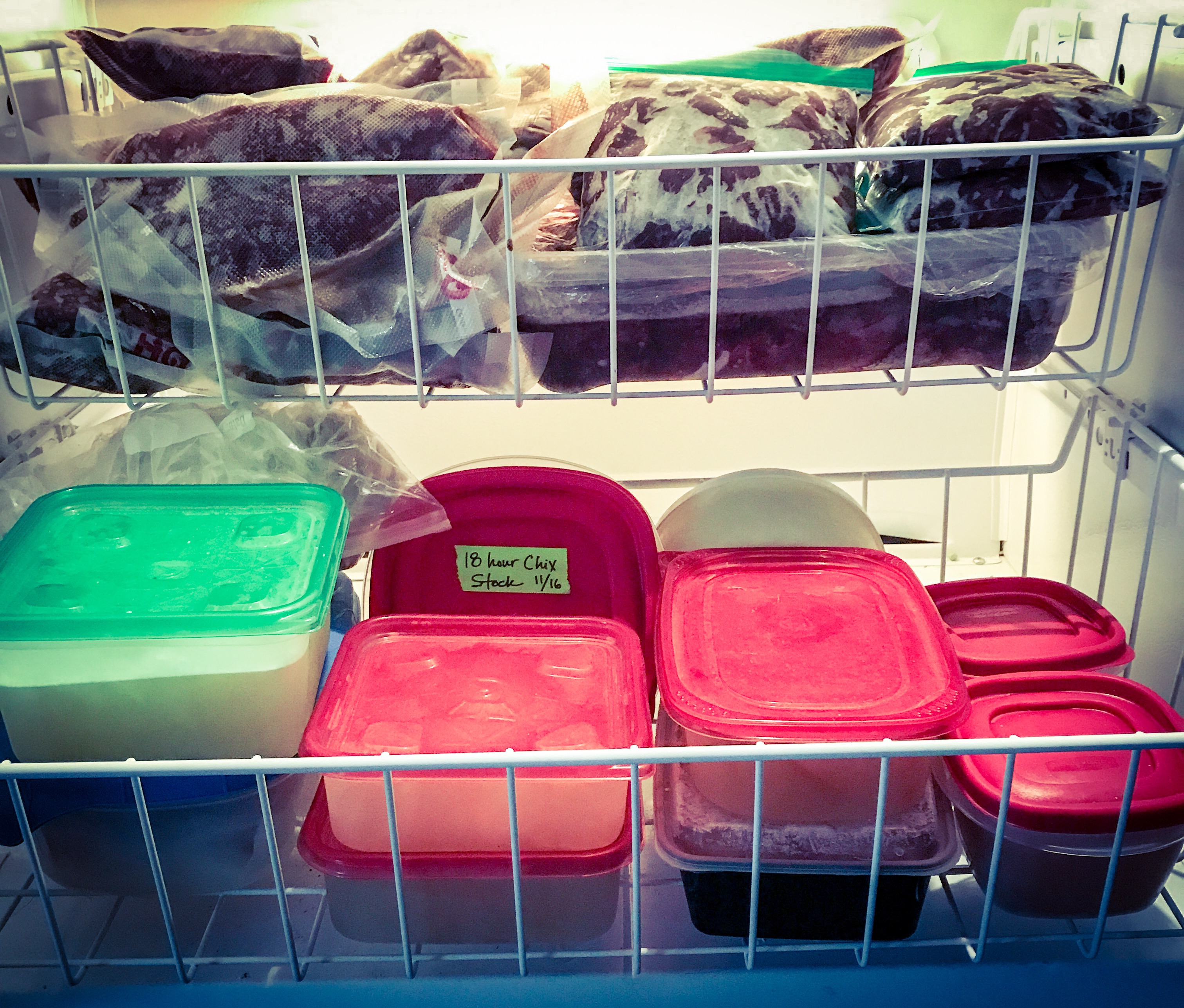 I use a ladle to stir/spoon the stock into individual containers so that they’re balanced with flavor. If you have one set aside with chicken/turkey, make sure it’s a larger Tupperware. BIG HINT: using multiple smaller containers means you can defrost only what you need.