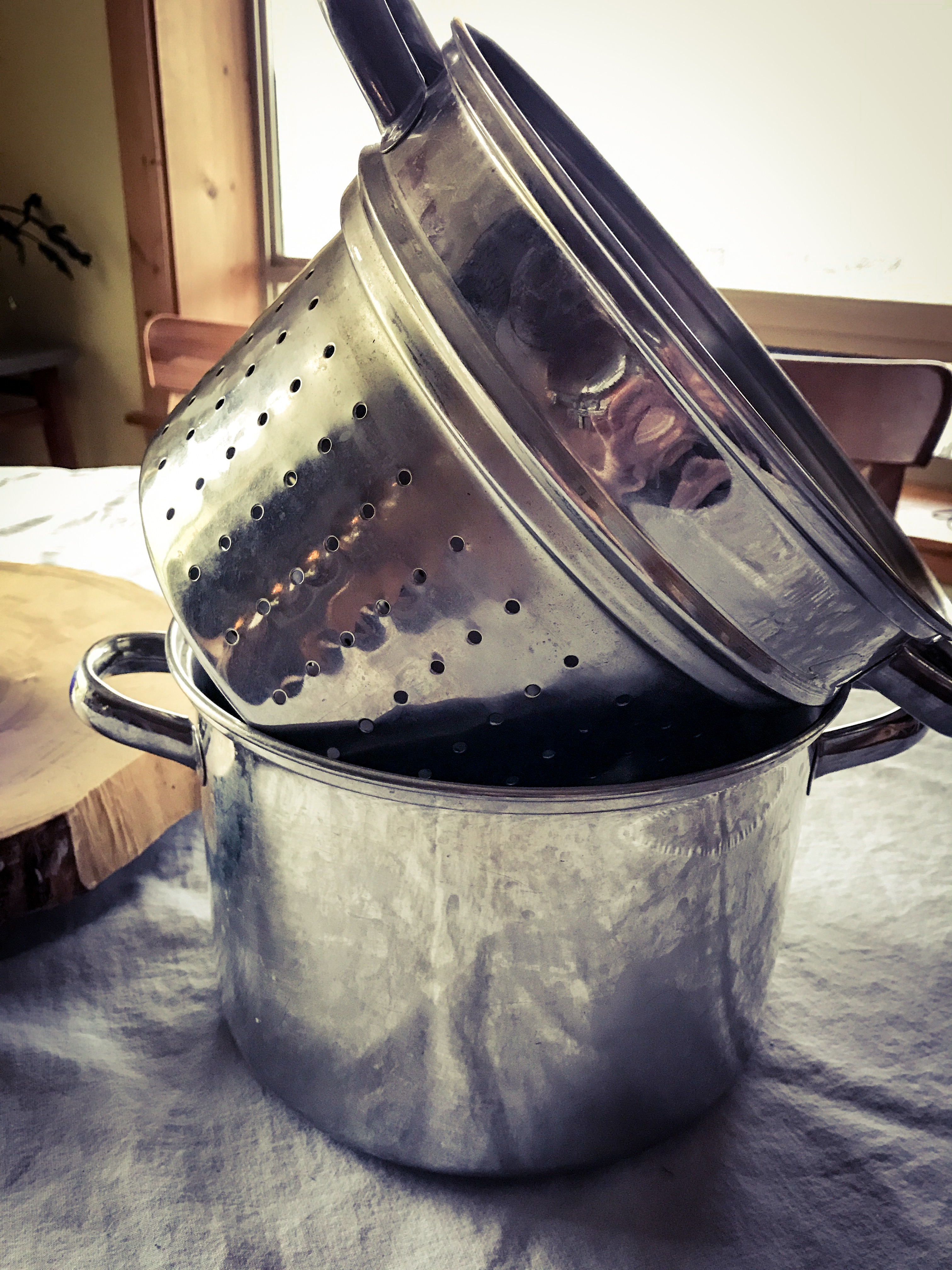 With drainer inside the stock pot, I toss/scrape/cajole every bit of the carcass and it’s affiliates straight in (salty, fatty bits, solidified fat-gravy – everything goes in.)